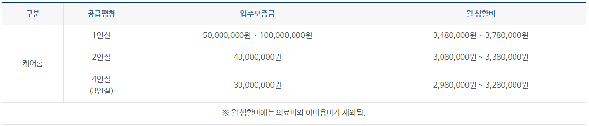 입주 비용은 신관/본관과 케어홈이 다른데, 아래와 같다. (그림을 터치하시면 크게 보실 수 있음)