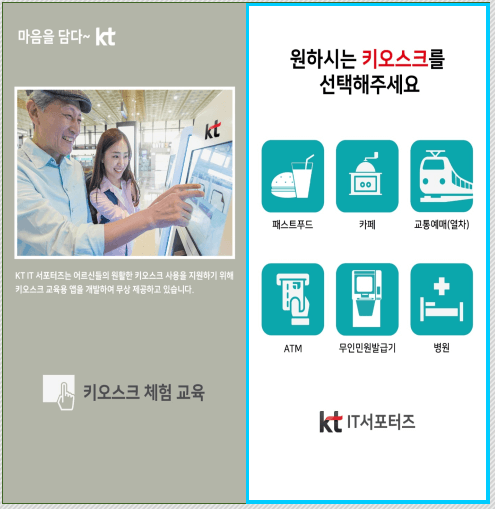 요즘 휴대폰은 다 가지고 계시니까, KT '키오스크 교육용 앱'을 다운로드하시면 된다.